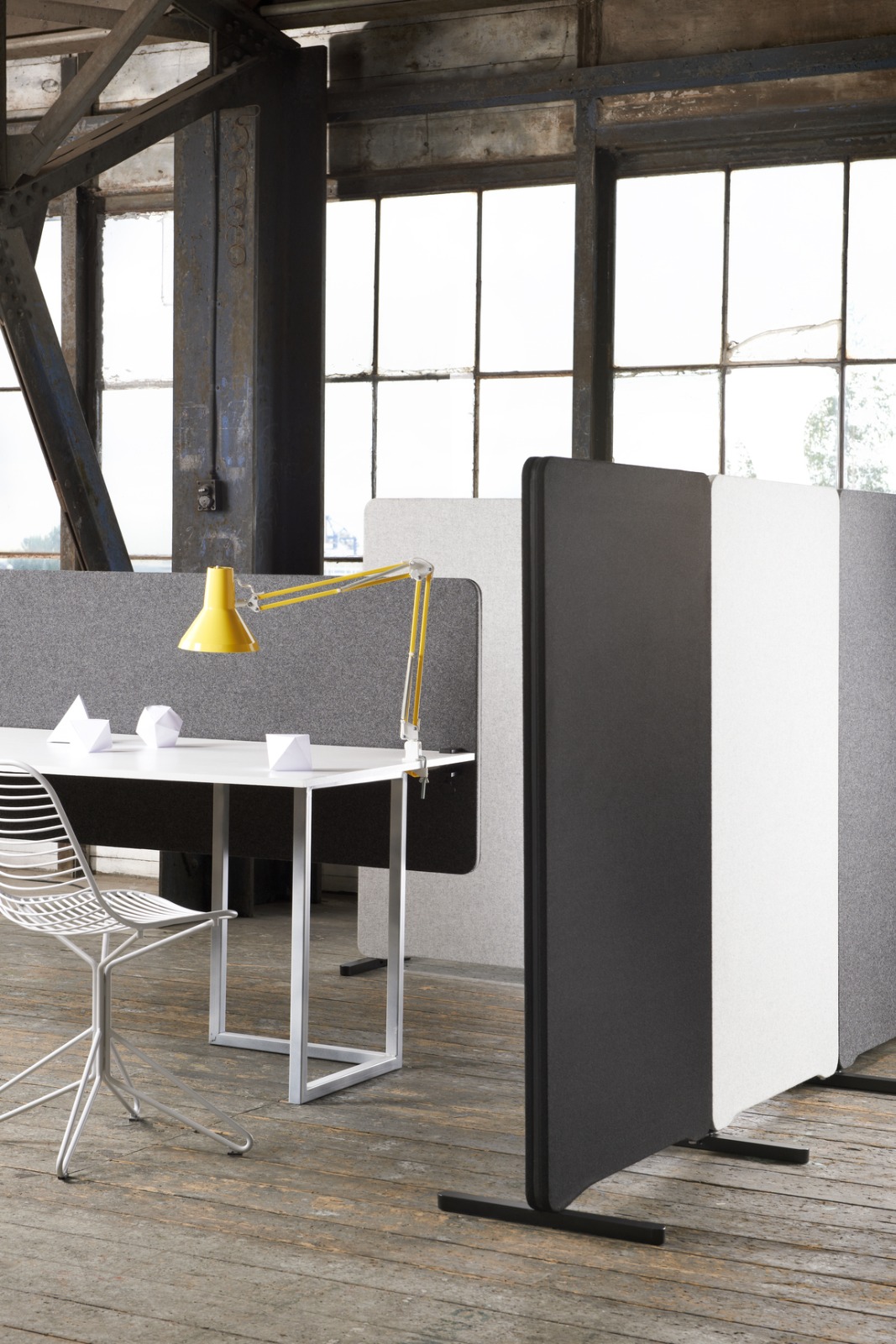 Du kan bruge lydabsorberende indretningselementer og lave arealplanlægning og derved opdele det store rum til mindre rum. Sæt fritstående skærmvægge op. Skærmvæggene har et lydabsorberende tekstilmateriale på en eller begge sider og kan flyttes rundt som det passer jer, så de bliver en